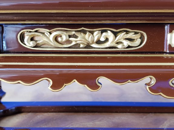 手塗本漆うるみ色・蒔絵師の繊細な線・箔置き師の細かい所の裏金仕上げ